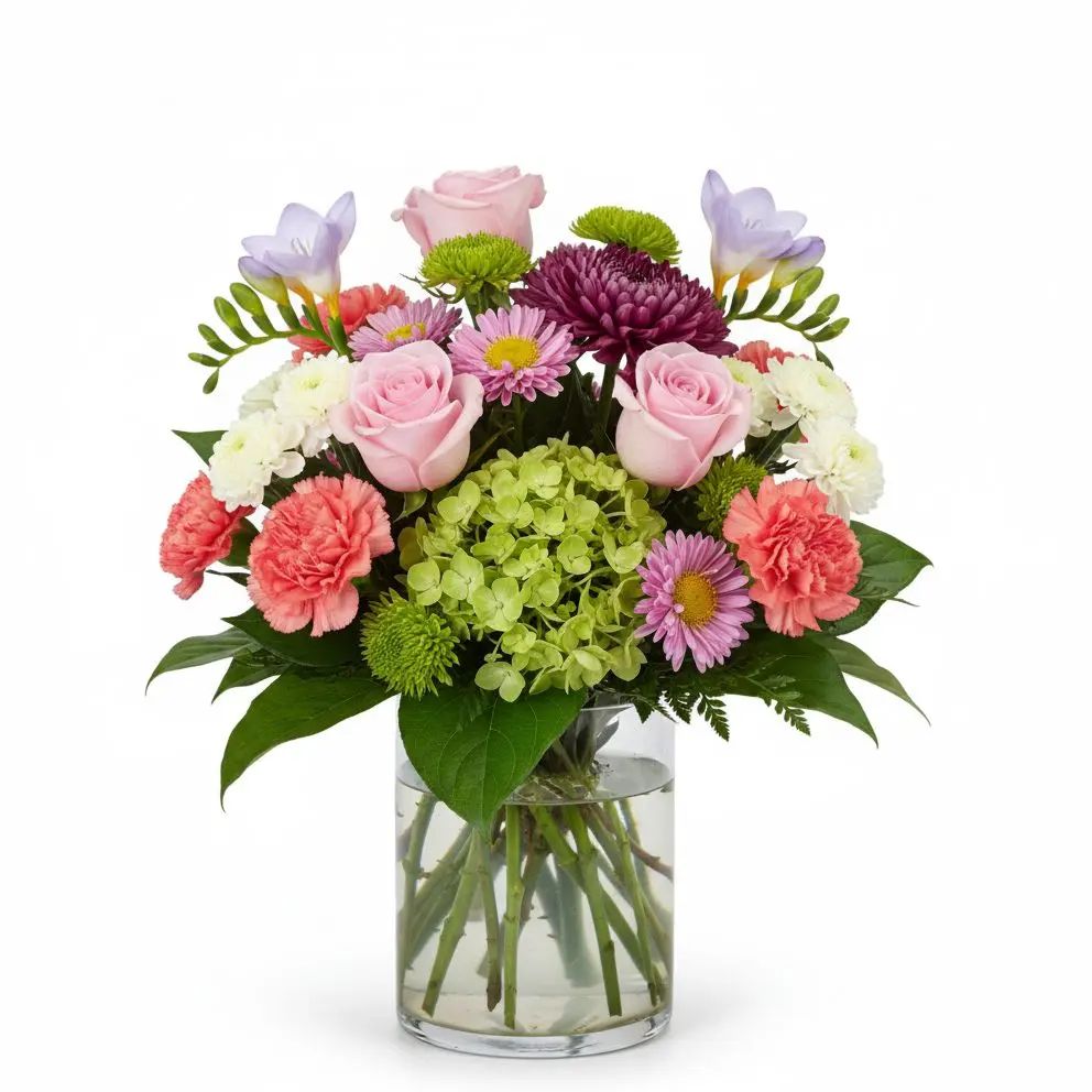 Discover the exquisite charm of the Botanical Bloom Collective, a vibrant symphony of fresh roses, freesia, hydrangeas, and diverse chrysanthemums. This stunning arrangement is meticulously crafted to bring joy and natural elegance to any space. Elevate your surroundings with this truly uplifting and beautiful floral masterpiece.